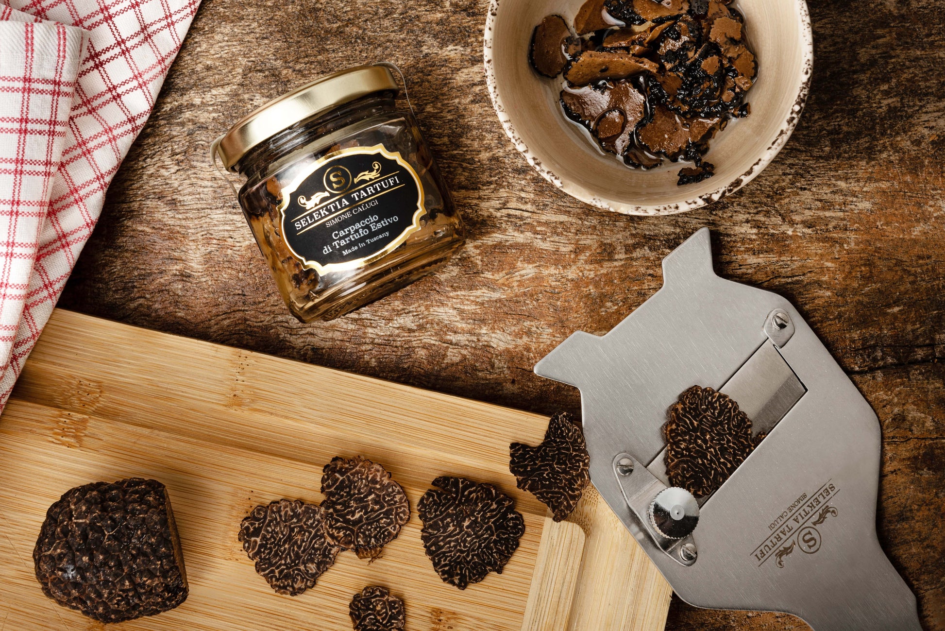 Fein geschnittenes Carpaccio aus Sommertrüffeln (Tuber aestivum Vitt.) in Sonnenblumenöl, mit zartem Aroma und mildem Geschmack, abgerundet durch die typischen würzigen Noten der Toskana.